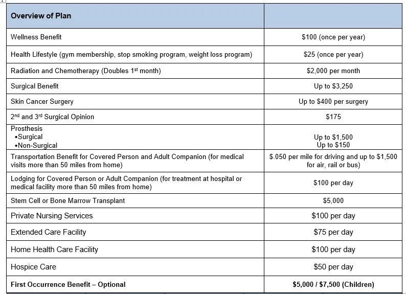 Below are some of the tax free benefits payable directly to insured starting at first positive diagnosis of cancer including skin cancer: