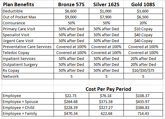 The below is a quick summary of the plans available with the cost per pay period. To see the full benefit summary for each plan, click the links below.